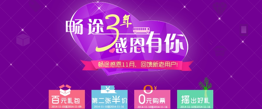 為了慶祝暢途網(wǎng)成立3周年,在11月份,暢途網(wǎng)推出了一整月的活動,有:11.3-11.9購票送百元禮包,11.10-11.16第二張票半價(jià),11.17-11.23 0元購票,11.24-11.30搖錢樹送好禮。活動多多,優(yōu)惠多多,讓大家在輕松享受購票的同時,帶給大家更多的實(shí)惠與樂趣!